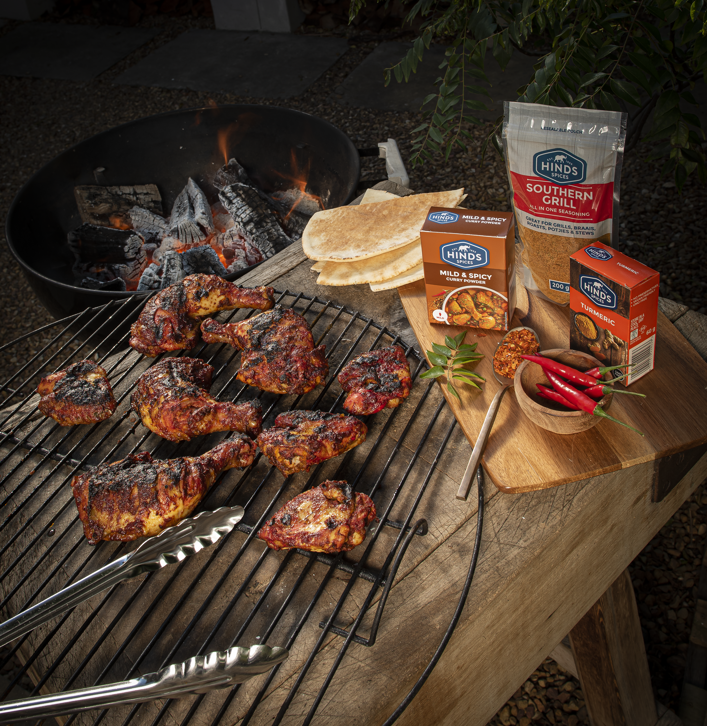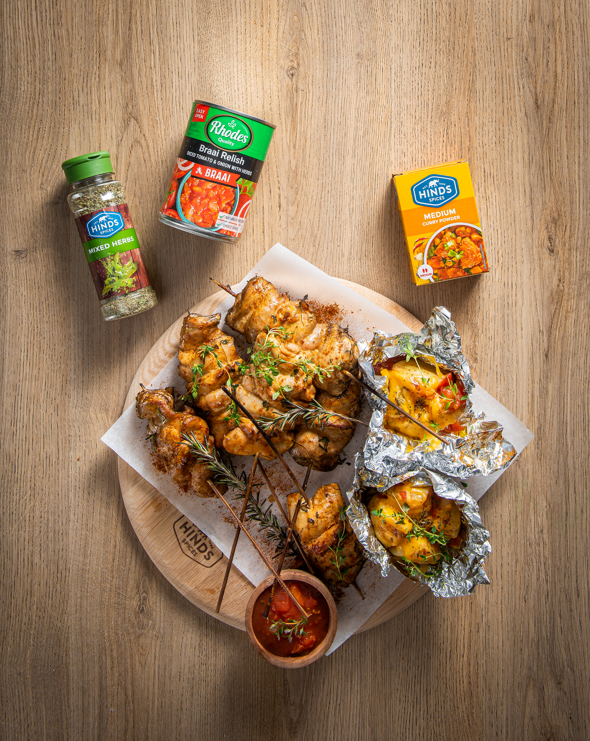 Curry Spiced Chicken Kebabs with Braaied Jacket Potatoes and Braai Relish